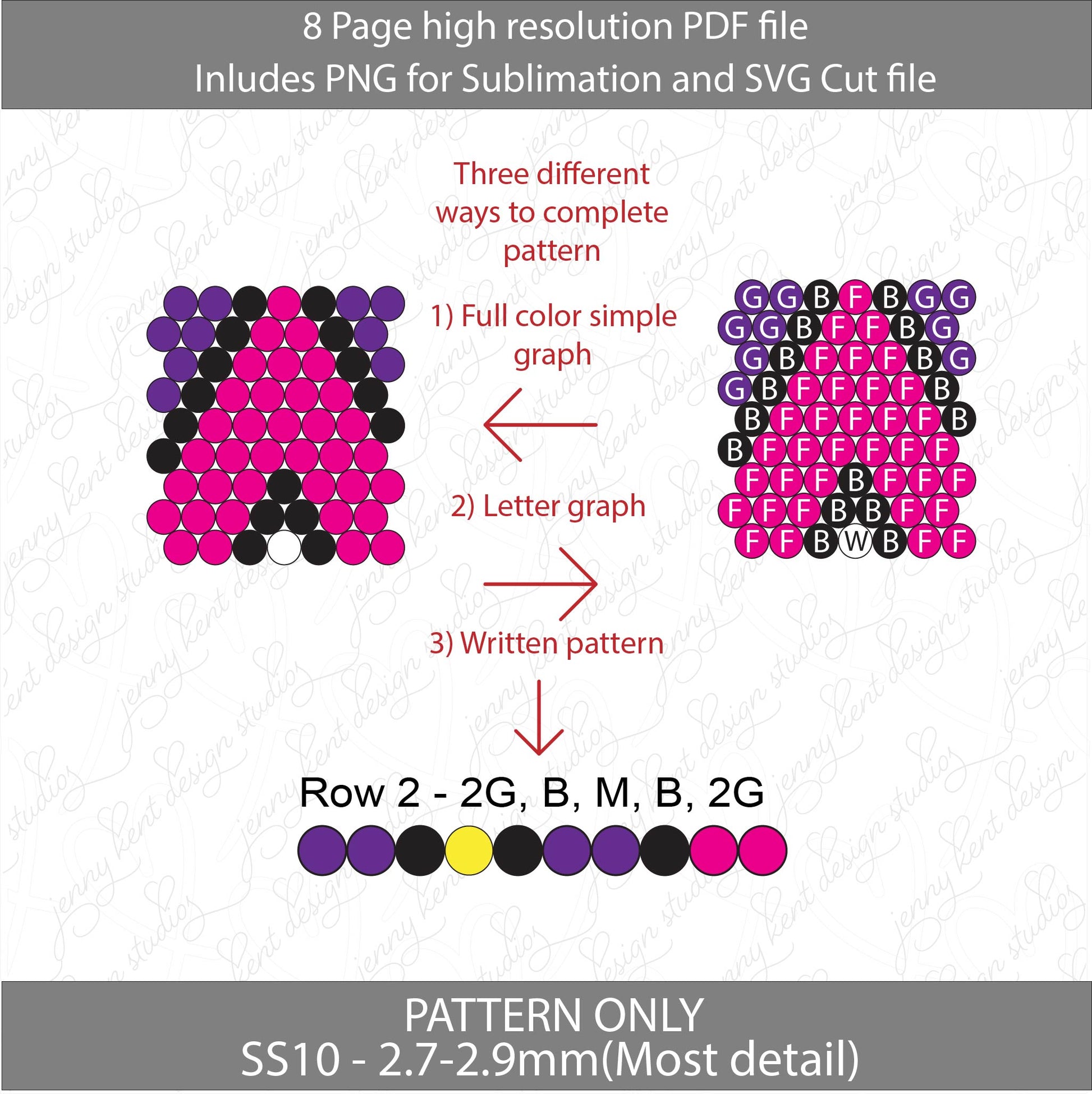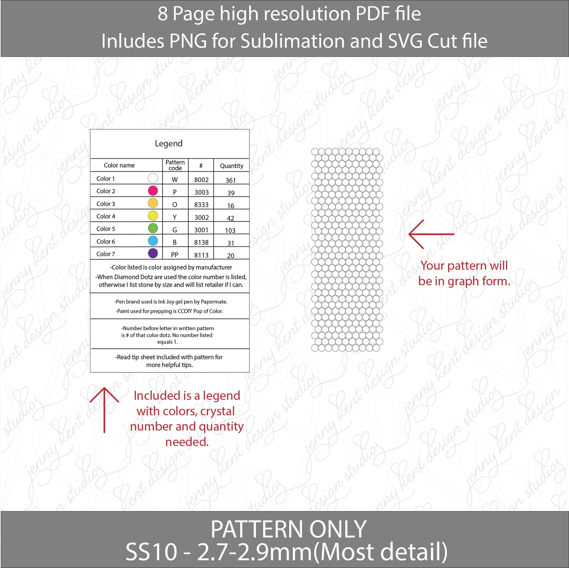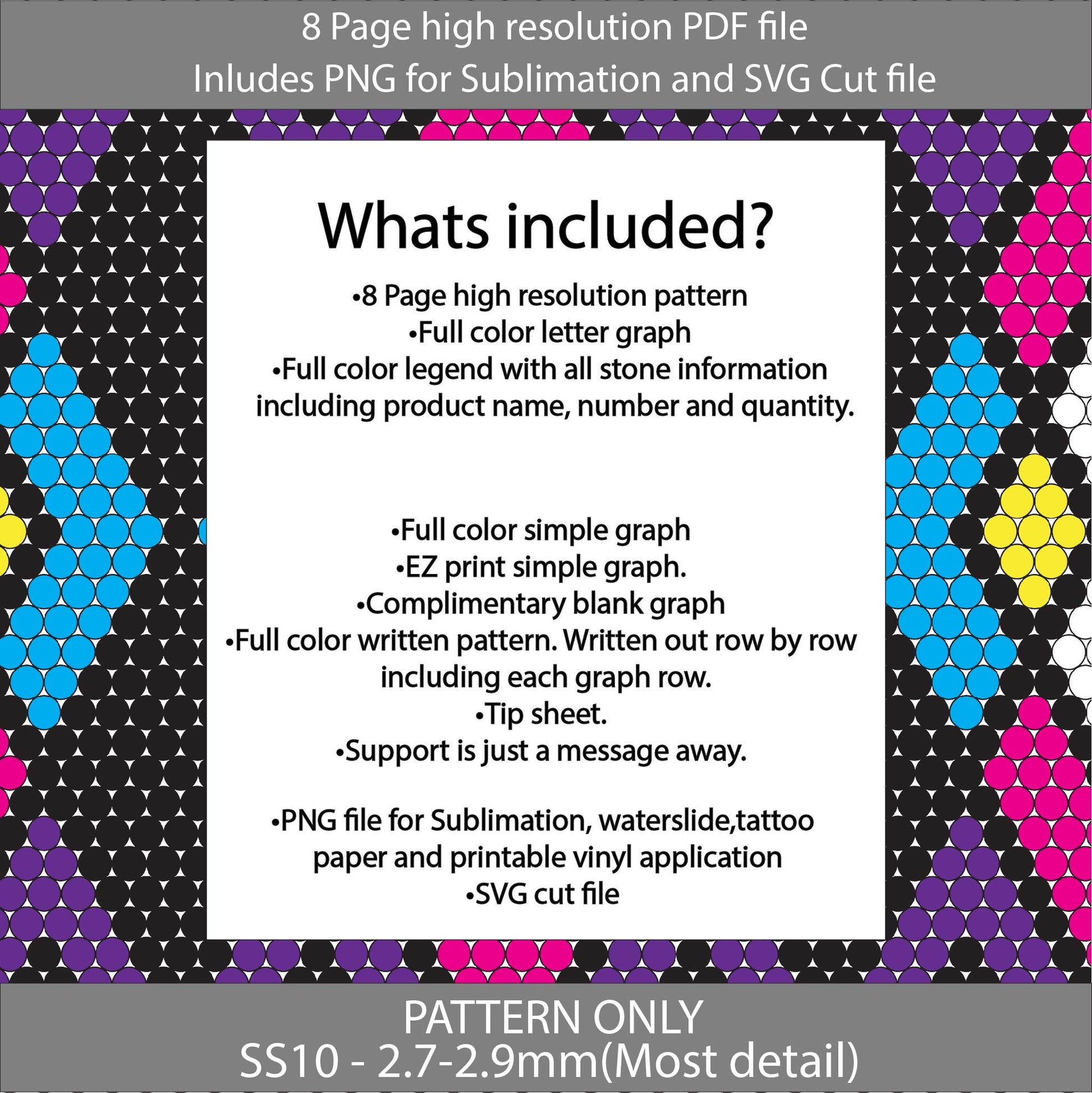 You will receive a 8 page PDF with a square placement graph pattern. You will also receive a color chart with brand of rhinestones used, color number and quantity used.