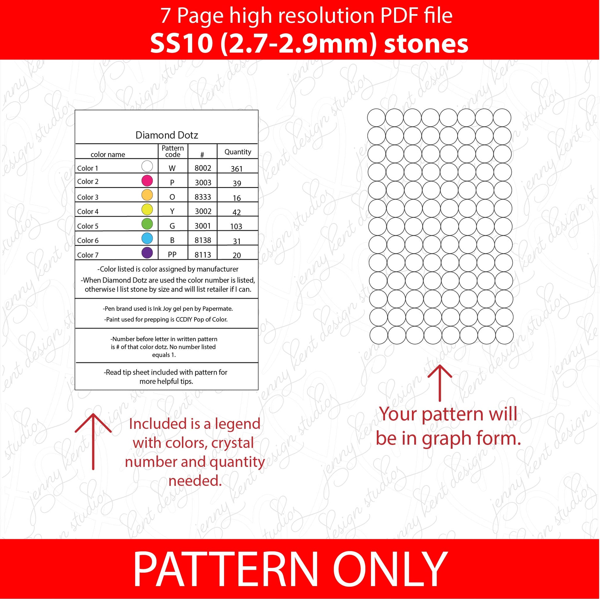 This pattern remains the property of Jenny Kent Design studio. DO NOT REPRODUCE this pattern in any way. DO NOT sell pattern. DO NOT share pattern with anyone else. Applying this template to any surface to sell as a READY TO BLING item is a violation of this purchase as a special license is needed to do so.